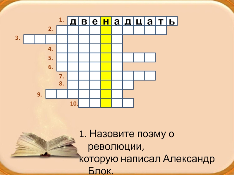 двенадцать1.2.3.4.5.6.7.8.9.10.1. Назовите поэму о революции,которую написал Александр Блок.