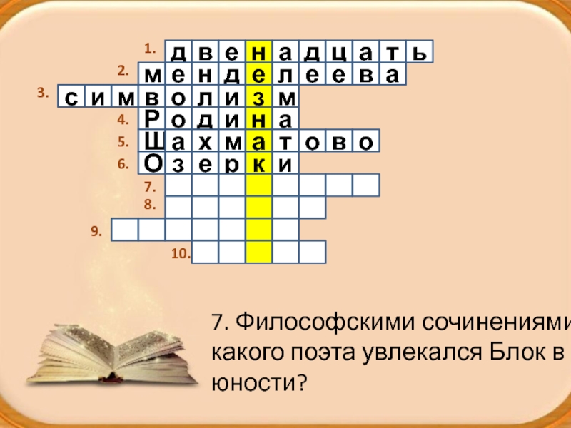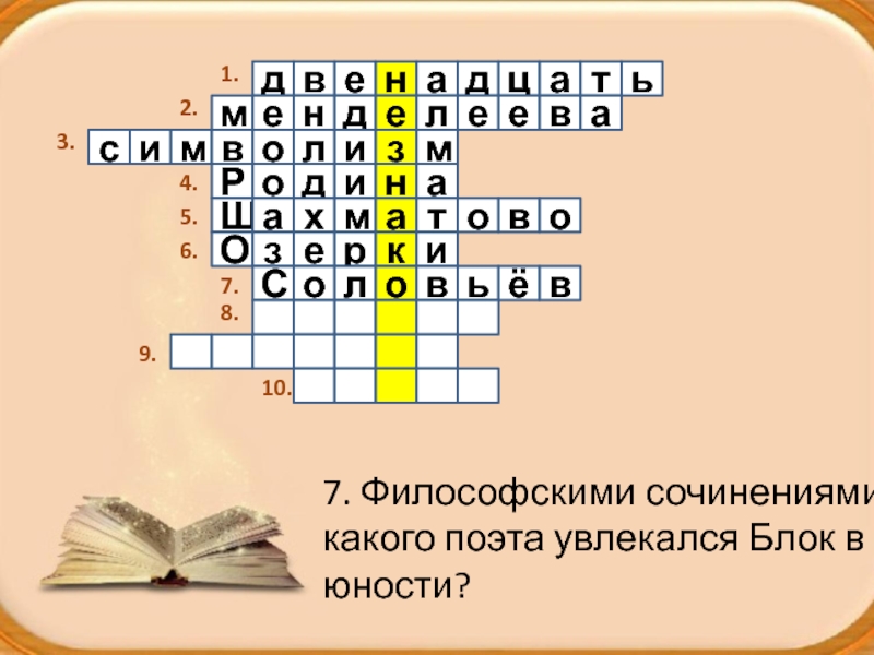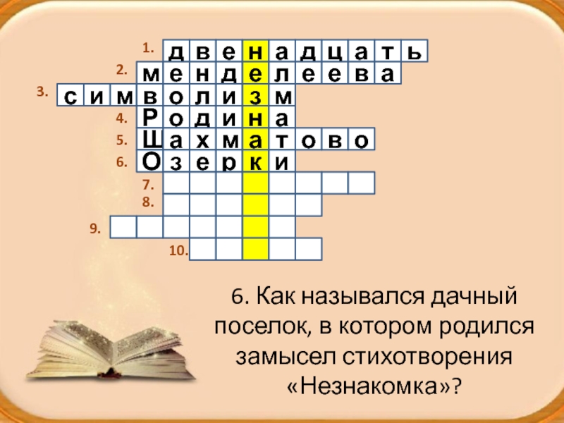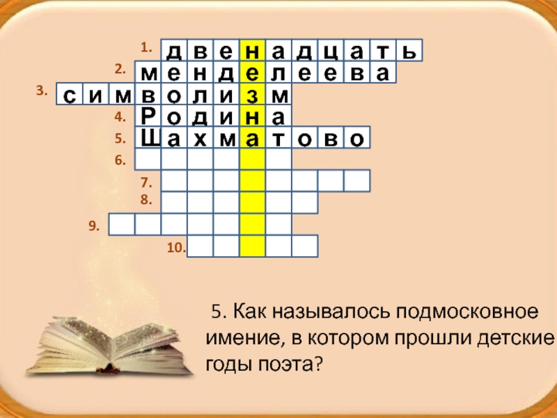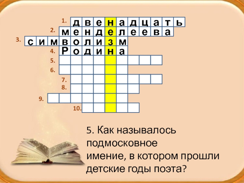 двенадцатьменделеевасимволизмРодина1.2.3.4.5.6.7.8.9.10.5. Как называлось подмосковное имение, в котором прошли детские годы поэта?