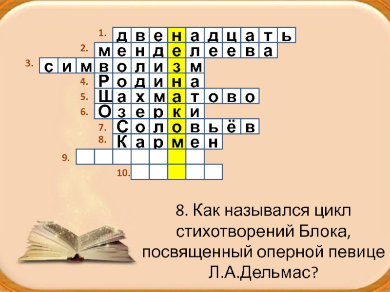 двенадцатьменделеевасимволизмРодинаШахматовоОзеркиСоловьёв1.2.3.4.5.6.7.8.9.10.8. Как назывался цикл стихотворений Блока, посвященный оперной певицеЛ.А.Дельмас?