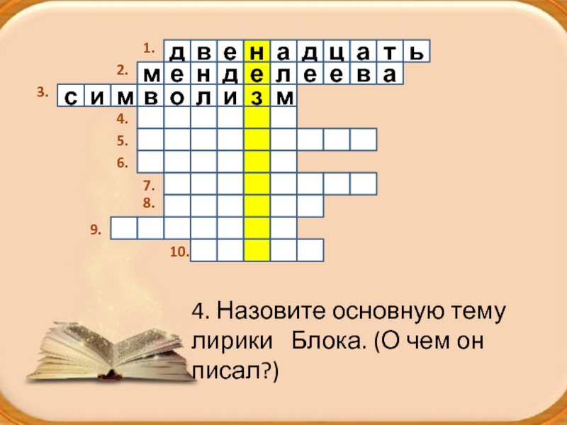 двенадцатьменделеевасимволизмРодина1.2.3.4.5.6.7.8.9.10.4. Назовите основную тему  лирики Блока. (О чем он писал?)