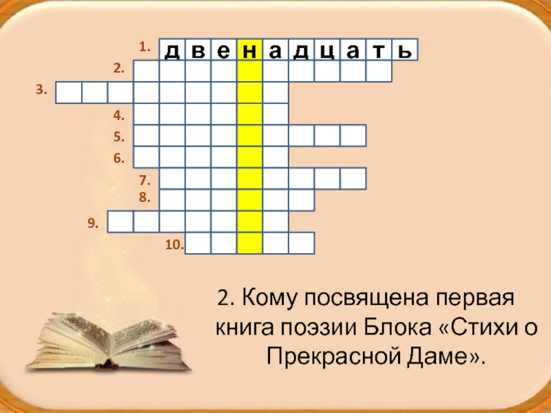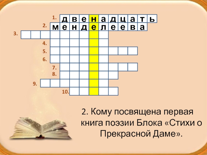двенадцатьменделеева1.2.3.4.5.6.7.8.9.10.2. Кому посвящена первая книга поэзии Блока «Стихи о Прекрасной Даме».