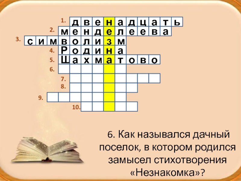 двенадцатьменделеевасимволизмРодинаШахматово1.2.3.4.5.6.7.8.9.10. 5. Как называлось подмосковное имение, в котором прошли детскиегоды поэта?