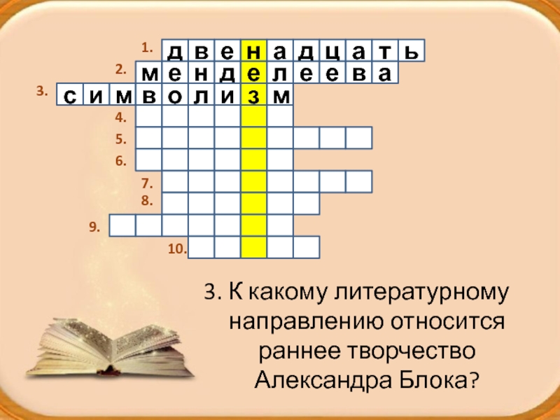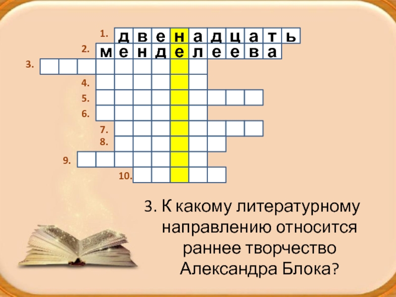 двенадцатьменделеева1.2.3.4.5.6.7.8.9.10.3. К какому литературному направлению относится раннее творчество Александра Блока?