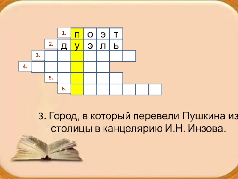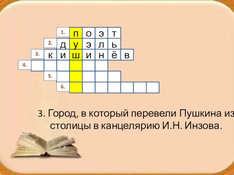 3. Город, в который перевели Пушкина из столицы в канцелярию И.Н. Инзова. 3.