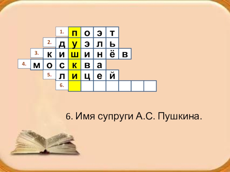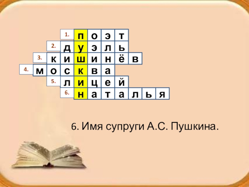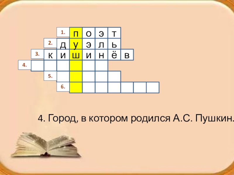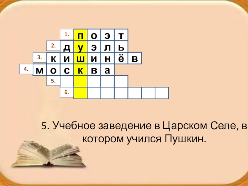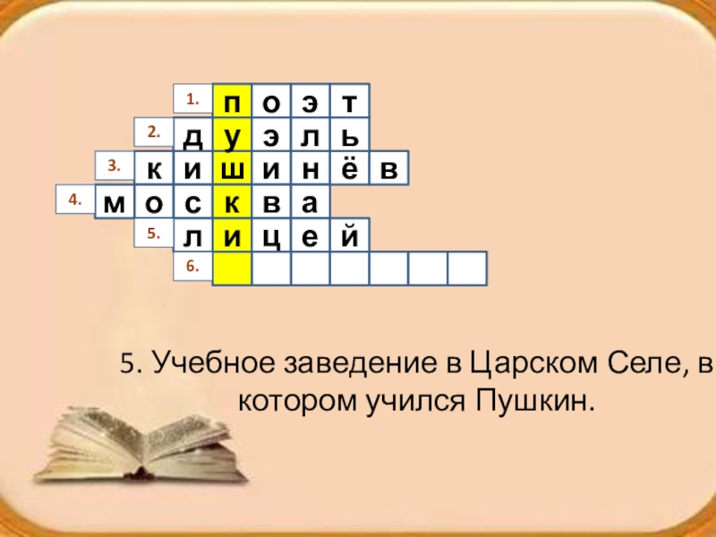5. Учебное заведение в Царском Селе, в котором учился Пушкин. 3.