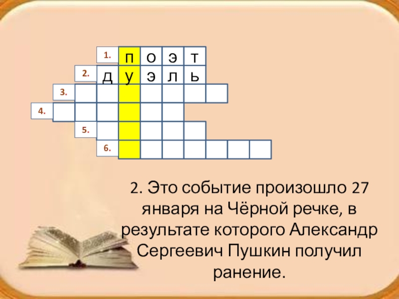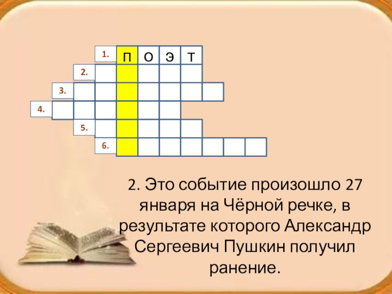 2. Это событие произошло 27 января на Чёрной речке, в результате которого Александр Сергеевич Пушкин получил ранение.