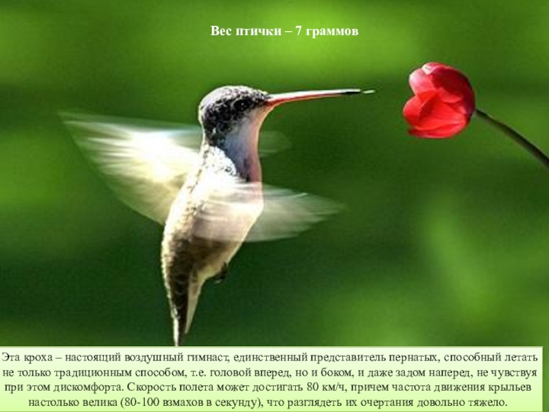 представитель пернатых, способный летать не только традиционным способом, т.е. головой вперед, но и боком, и даже задом наперед, не чувствуя при этом дискомфорта. Скорость полета может достигать 80 км/ч, причем частота движения крыльев настолько велика (80-100 взмахов в секунду), что разглядеть их очертания довольно тяжело.