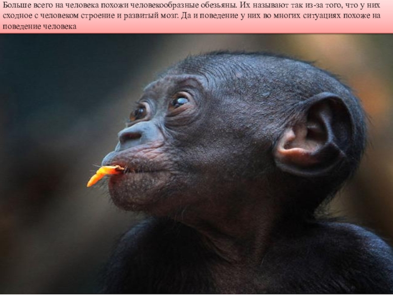 Слайд 35Больше всего на человека похожи человекообразные обезьяны. Их называют так из-за