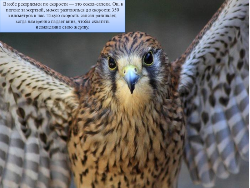 Слайд 5В небе рекордсмен по скорости — это сокол-сапсан. Он, в погоне