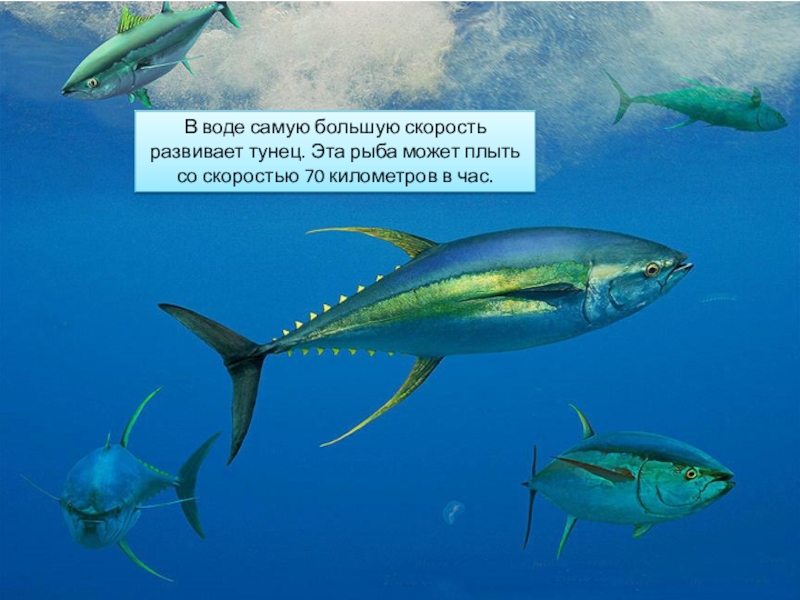 Слайд 7В воде самую большую скорость развивает тунец. Эта рыба может плыть
