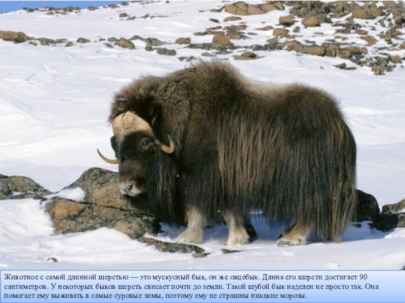 Слайд 27Животное с самой длинной шерстью — это мускусный бык, он же