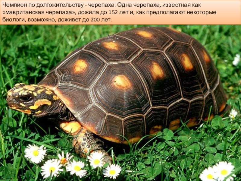 Слайд 19Чемпион по долгожительству - черепаха. Одна черепаха, известная как «мавританская черепаха»,