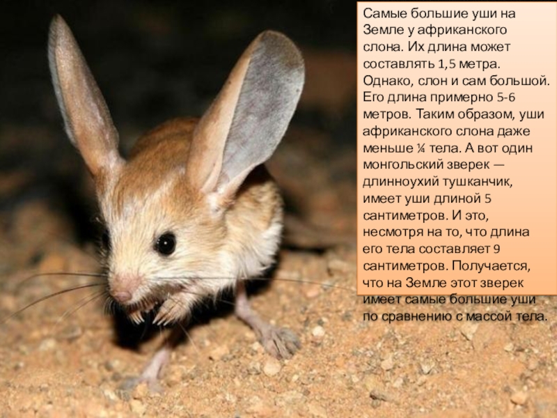 составлять 1,5 метра. Однако, слон и сам большой. Его длина примерно 5-6 метров. Таким образом, уши африканского слона даже меньше ¼ тела. А вот один монгольский зверек — длинноухий тушканчик, имеет уши длиной 5 сантиметров. И это, несмотря на то, что длина его тела составляет 9 сантиметров. Получается, что на Земле этот зверек имеет самые большие уши по сравнению с массой тела.