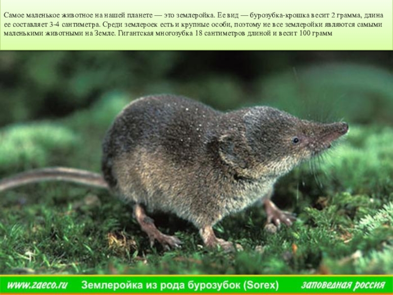 — бурозубка-крошка весит 2 грамма, длина ее составляет 3-4 сантиметра. Среди землероек есть и крупные особи, поэтому не все землеройки являются самыми маленькими животными на Земле. Гигантская многозубка 18 сантиметров длиной и весит 100 грамм
