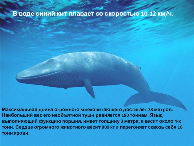 Слайд 12Максимальная длина огромного млекопитающего достигает 33 метров. Наибольший вес его необъятной