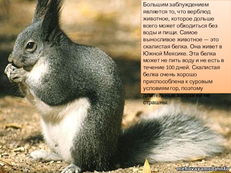 обходиться без воды и пищи. Самое выносливое животное — это скалистая белка. Она живет в Южной Мексике. Эта белка может не пить воду и не есть в течение 100 дней. Скалистая белка очень хорошо приспособлена к суровым условиям гор, поэтому длительные засухи ей не страшны.