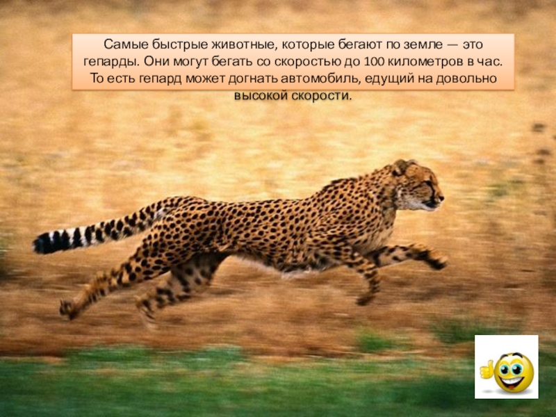Слайд 3Самые быстрые животные, которые бегают по земле — это гепарды. Они