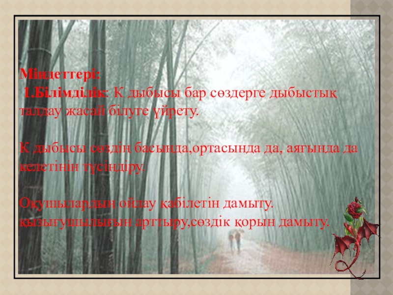 Міндеттері: 1.Білімділік: К дыбысы бар сөздерге дыбыстық талдау жасай білуге үйрету.К дыбысы сөздің басында,ортасында да, аяғында