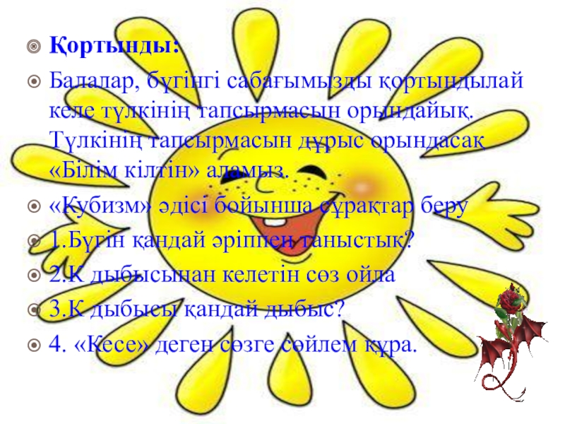 Қортынды:Балалар, бүгінгі сабағымызды қортындылай келе түлкінің тапсырмасын орындайық.Түлкінің тапсырмасын дұрыс орындасақ «Білім кілтін» аламыз.«Кубизм» әдісі бойынша сұрақтар