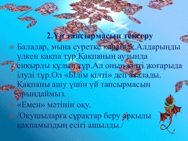 2.Үй тапсырмасын тексеруБалалар, мына суретке қарайық.Алдарыңды үлкен қақпа тұр.Қақпаның аузында сиқырлы құлып тұр.Ал оның кілті жоғарыда
