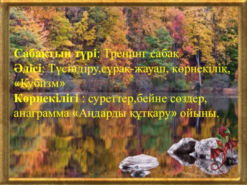 Сабақтың түрі: Тренинг сабақӘдісі: Түсіндіру,сұрақ-жауап, көрнекілік,«Кубизм»Көрнекілігі : суреттер,бейне сөздер,анаграмма «Аңдарды құтқару» ойыны.