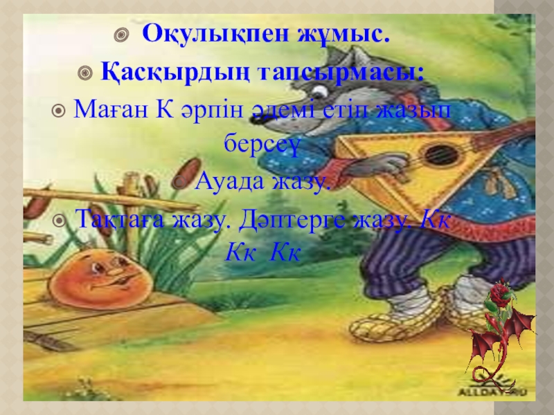 Оқулықпен жұмыс.Қасқырдың тапсырмасы:Маған К әрпін әдемі етіп жазып берсеүАуада жазу.Тақтаға жазу. Дәптерге жазу. Кк  Кк