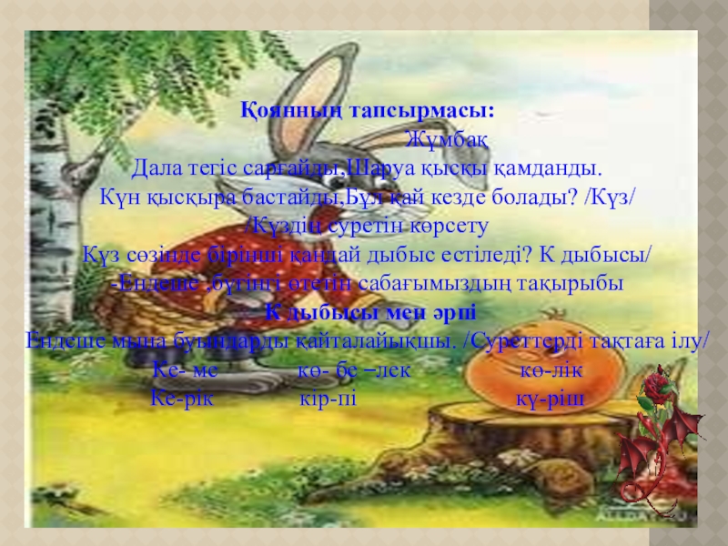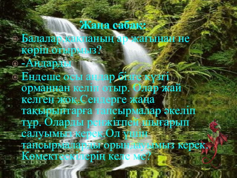 Ендеше осы аңдар бізге күзгі орманнан келіп отыр. Олар жай келген жоқ.Сендерге жаңа тақырыптарға тапсырмалар әкеліп тұр. Оларды ренжітпей шығарып салуымыз керек.Ол үшін тапсырмаларды орындауымыз керек. Көмектескілерің келе ме?