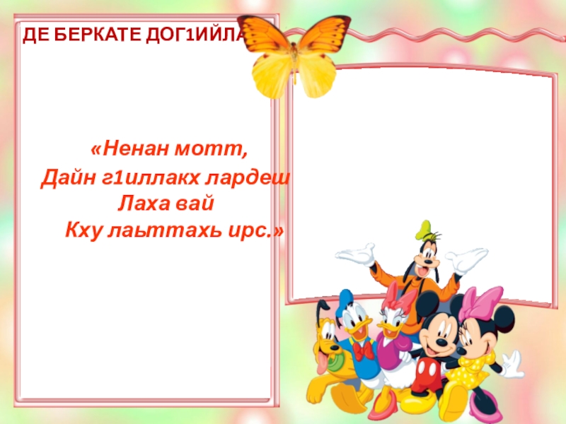 ДЕ БЕРКАТЕ ДОГ1ИЙЛА!   «Ненан мотт,Дайн г1иллакх лардеш Лаха вай  Кху лаьттахь ирс.»