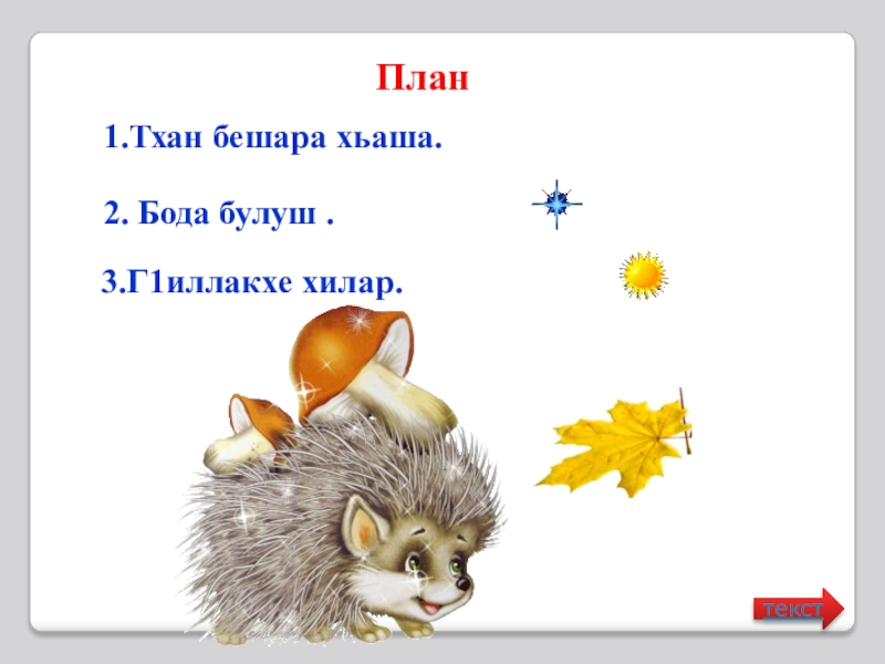 План    2. Бода булуш .    1.Тхан бешара хьаша.  3.Г1иллакхе хилар.