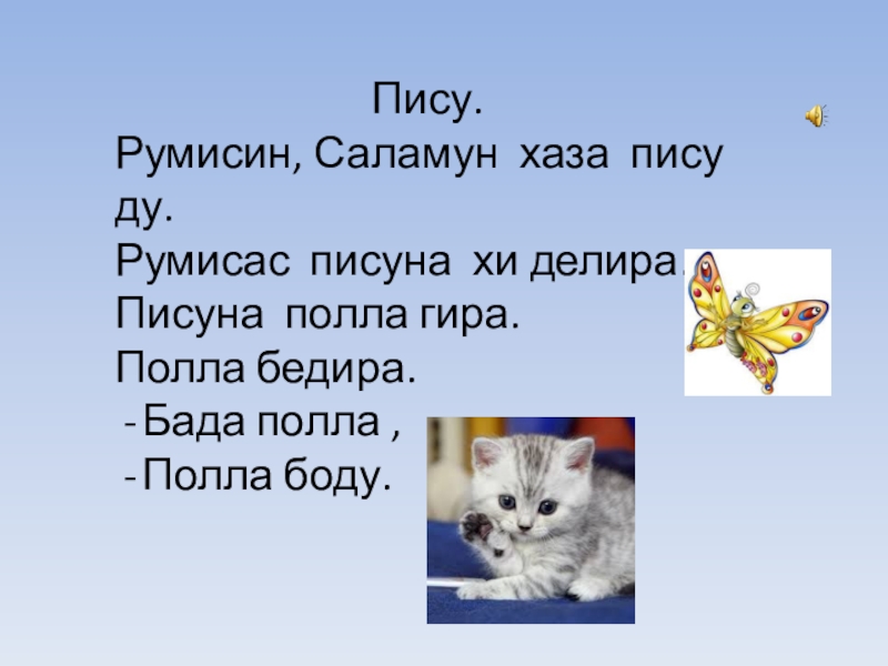 Пису.Румисин, Саламун хаза пису ду.Румисас писуна хи делира. Писуна полла гира.Полла бедира.Бада полла , Полла боду.