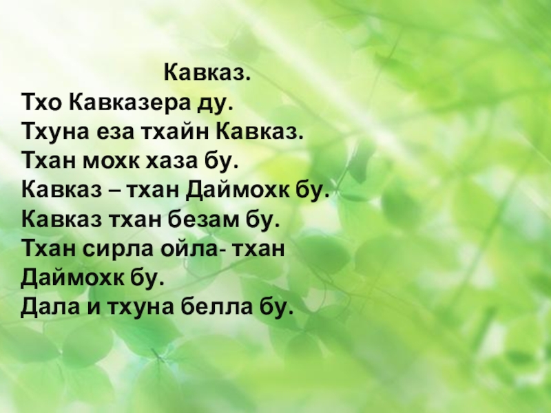 Кавказ.Тхо Кавказера ду. Тхуна еза тхайн Кавказ.Тхан мохк хаза бу.Кавказ – тхан Даймохк бу.Кавказ тхан безам бу.Тхан