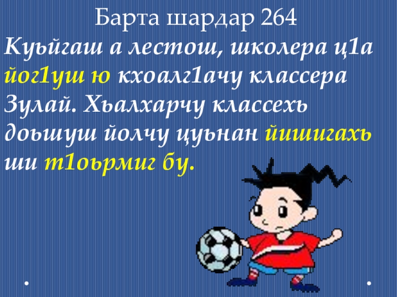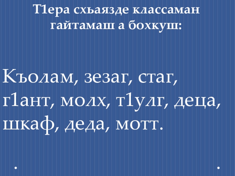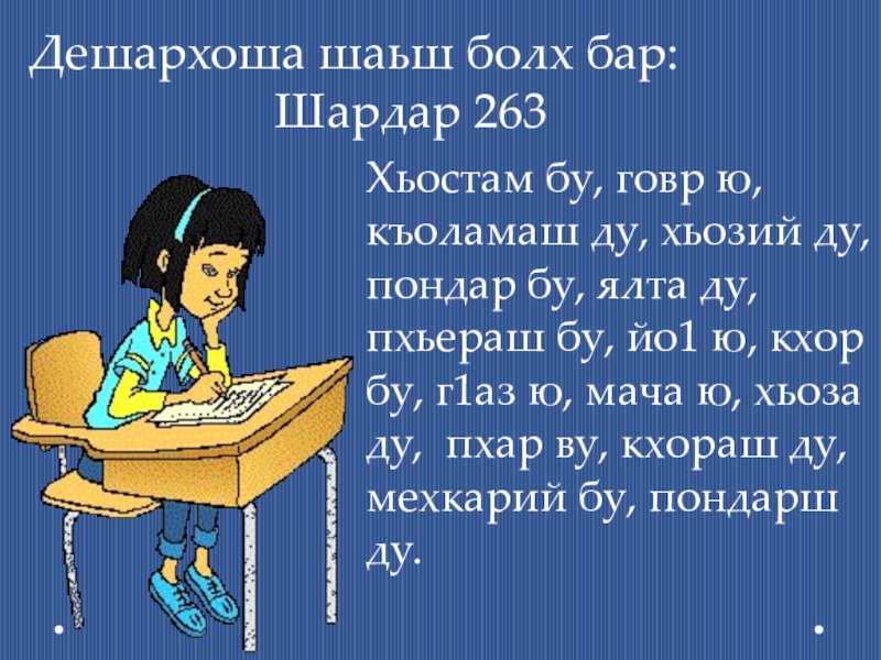Хьостам бу, говр ю, къоламаш ду, хьозий ду, пондар бу, ялта ду, пхьераш бу, йо1 ю, кхор бу, г1аз ю, мача ю, хьоза ду, пхар ву, кхораш ду, мехкарий бу, пондарш ду.