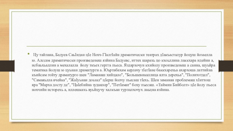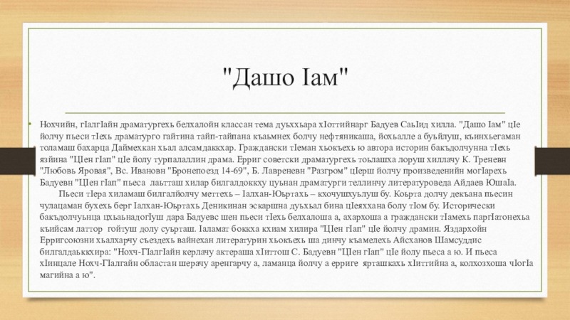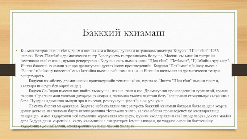 Слайд 7 Цу тайпана, Бадуев СаьIидан цIе Нохч-ГIалгIайн драматически театрах дIакъасталур йоцуш йозаелла