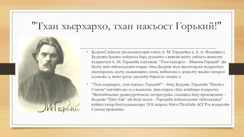 Слайд 12"Тхан хьерхархо, тхан накъост Горький!"