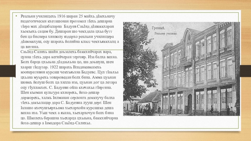 Слайд 4Реальни училищехь 1916 шеран 25 майхь дIаехьначу педагогически кхеташонан протокол тIехь