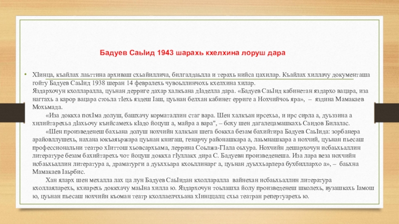 Слайд 2Бадуев Саь1ид-Салихь прозаик, драматург, поэт, нохчийн исбаьхьаллин литературин бухбиллархо, вина 1903
