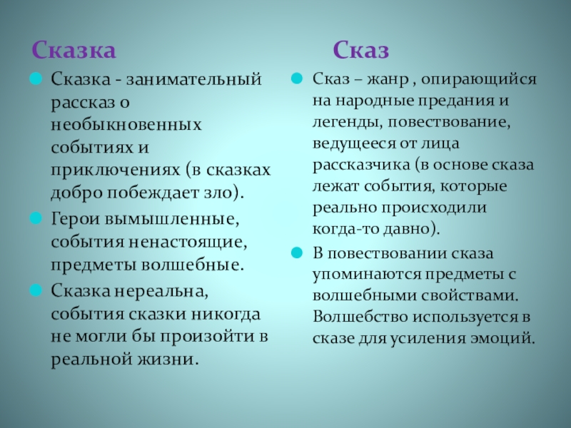 Сказ – жанр , опирающийся на народные предания и легенды, повествование, ведущееся от лица рассказчика (в основе сказа лежат события, которые реально происходили когда-то давно).