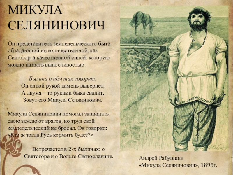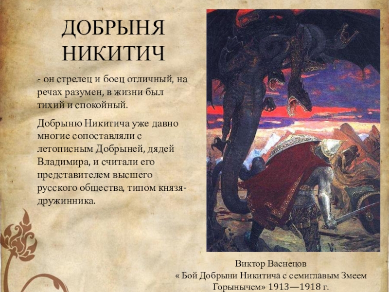 Добрыню Никитича уже давно многие сопоставляли с летописным Добрыней, дядей Владимира, и считали его представителем высшего русского общества, типом князя-дружинника.