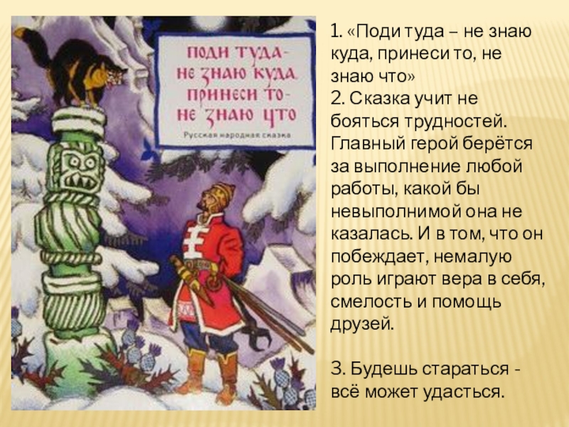 1. «Поди туда – не знаю куда, принеси то, не знаю что»2. Сказка учит не бояться трудностей.