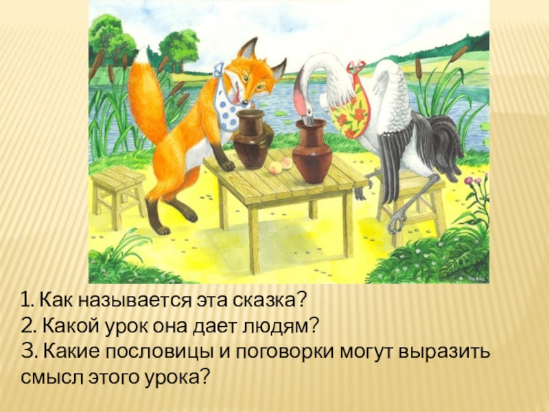 1. Как называется эта сказка?2. Какой урок она дает людям?3. Какие пословицы и поговорки могут выразить смысл