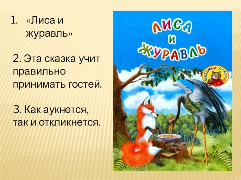 «Лиса и журавль»2. Эта сказка учит правильно принимать гостей.3. Как аукнется, так и откликнется.