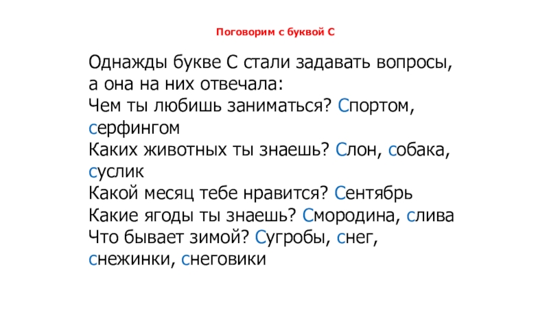 Поговорим с буквой С Однажды букве С стали задавать вопросы, а она на них отвечала:Чем ты любишь заниматься?