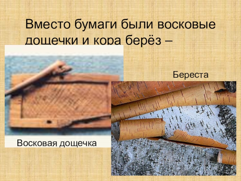 Слайд 3Вместо бумаги были восковые дощечки и кора берёз – береста.
