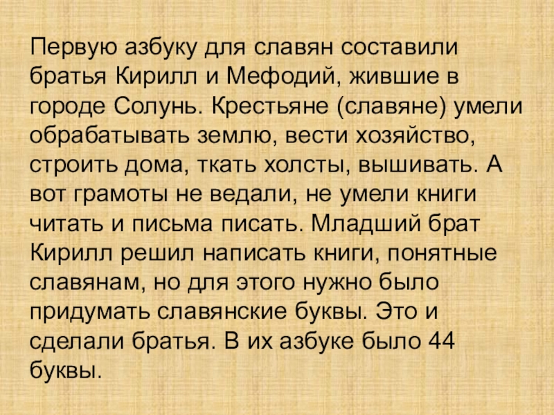 городе Солунь. Крестьяне (славяне) умели обрабатывать землю, вести хозяйство, строить дома, ткать холсты, вышивать. А вот грамоты не ведали, не умели книги читать и письма писать. Младший брат Кирилл решил написать книги, понятные славянам, но для этого нужно было придумать славянские буквы. Это и сделали братья. В их азбуке было 44 буквы.