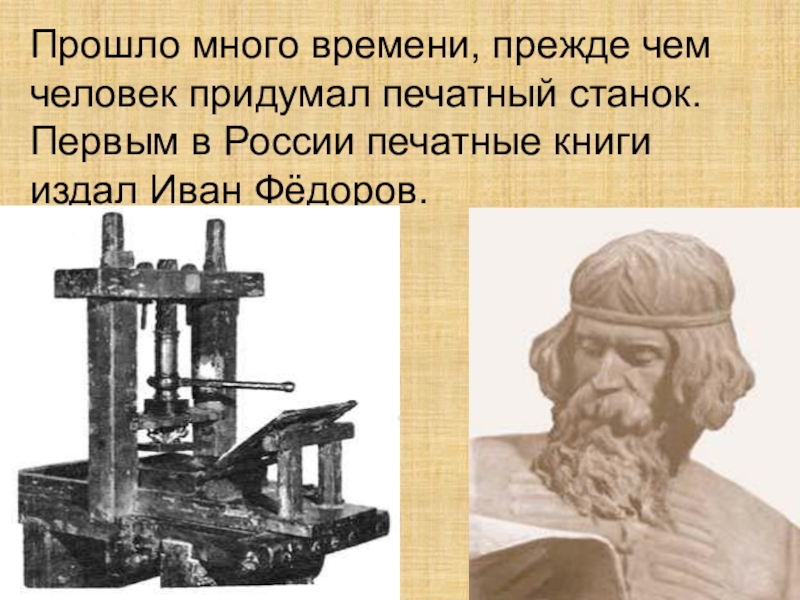 Прошло много времени, прежде чем человек придумал печатный станок. Первым в России печатные книги издал Иван Фёдоров.