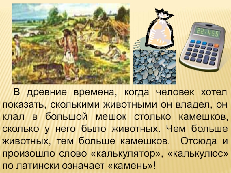 он клал в большой мешок столько камешков, сколько у него было животных. Чем больше животных, тем больше камешков. Отсюда и произошло слово «калькулятор», «калькулюс» по латински означает «камень»!