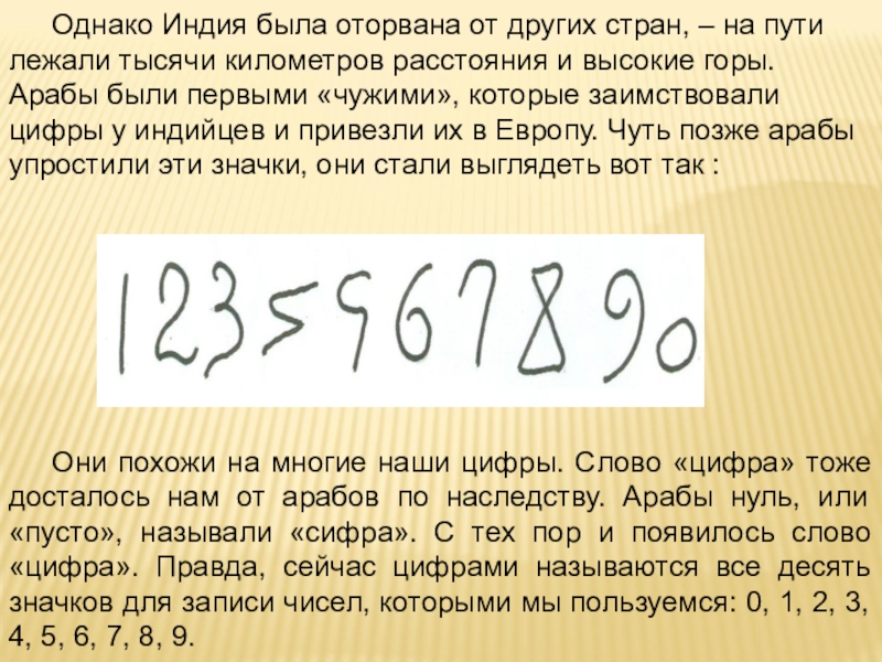 тысячи километров расстояния и высокие горы. Арабы были первыми «чужими», которые заимствовали цифры у индийцев и привезли их в Европу. Чуть позже арабы упростили эти значки, они стали выглядеть вот так :