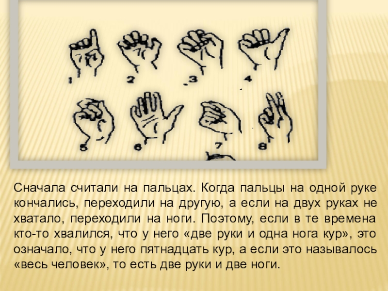 Слайд 5Сначала считали на пальцах. Когда пальцы на одной руке кончались, переходили