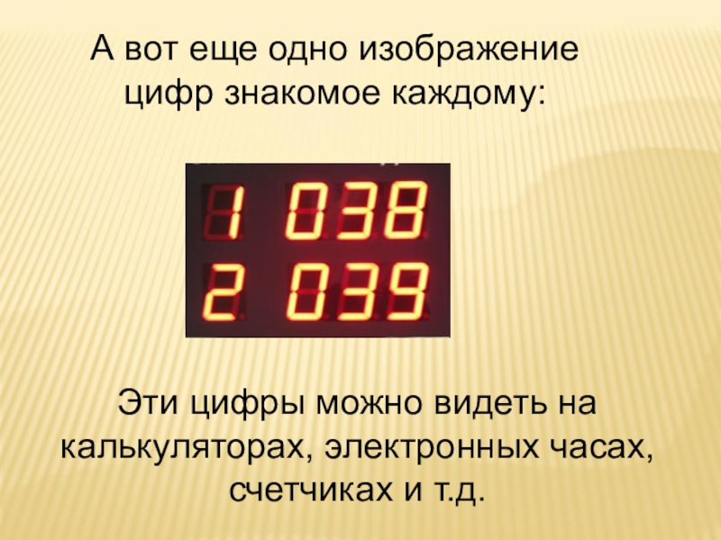 Эти цифры можно видеть на калькуляторах, электронных часах, счетчиках и т.д.