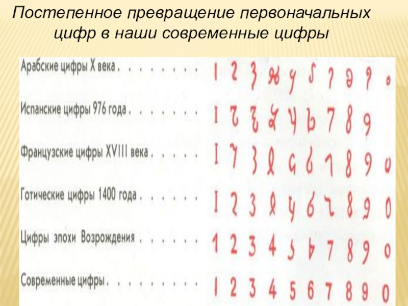 Слайд 14Постепенное превращение первоначальных цифр в наши современные цифры